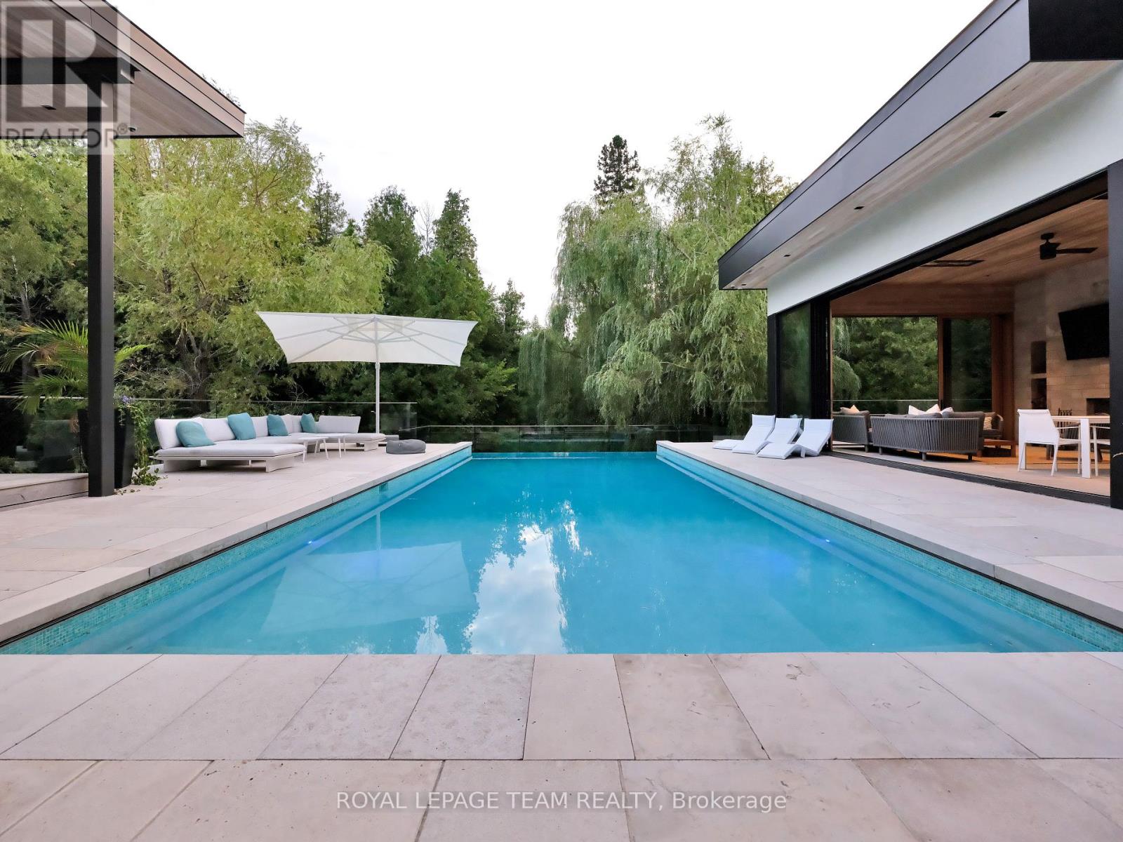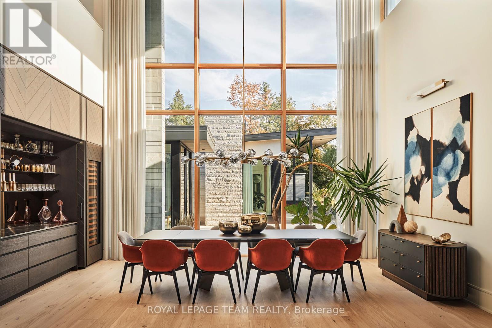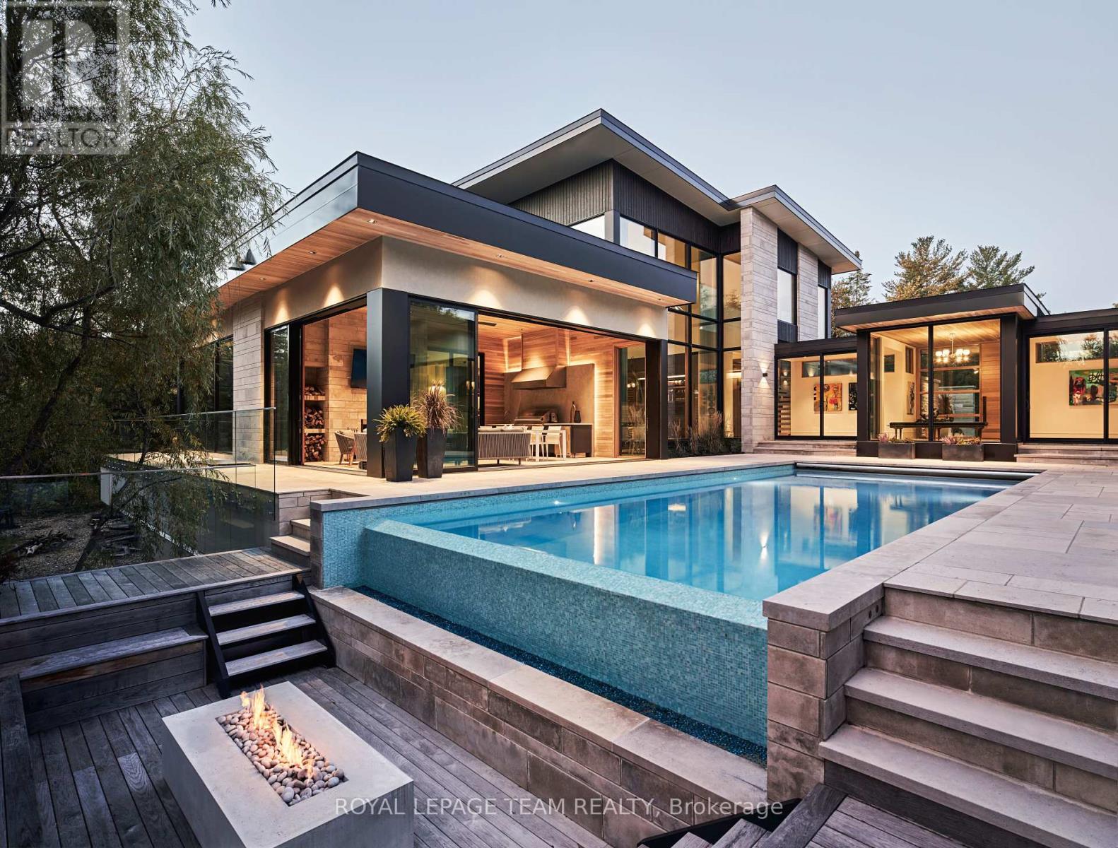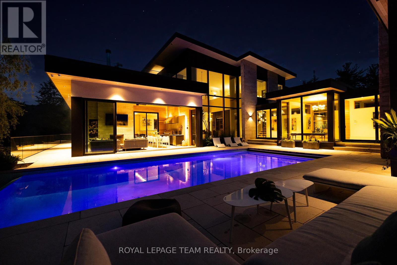 Discover a rare opportunity to own an architectural dream in the Kanata Rockeries. This ultra-private residence seamlessly blends elegance, innovative design, and the tranquility of nature in every space, offering a lifestyle of unparalleled luxury & a spa-like atmosphere right at home. Relax & unwind in the saltwater infnity pool overlooking the serene pond, soak in the hot tub, rejuvenate in the sauna & steam room, or cozy up by one of the 5 fre features. For ftness enthusiasts, the massive home gym is a haven, & nature lovers will appreciate the 6km nature hike accessible directly from your backyard. With over 9,000sf of meticulously curated living space, this home is designed for both intimate family living and grand-scale entertaining, indoors and out. The main foor is bathed in natural light, with panoramic views of the surrounding landscape. The primary retreat exudes elegance, wrapped in a warm, inviting ambiance & adorned with a lavish marble ensuite featuring heated foors, along with a dedicated makeup desk, a chic spacious walk-in closet, private laundry, & breathtaking foor-to-ceiling sliding glass wall to private deck & hot tub. The Chef's kitchen is a culinary masterpiece, featuring two 9ft islands & custom 15t banquet. Behind seamless custom cabinetry lies a hidden prep kitchen & pantry, featuring storage & secondary fridge & freezer. The dining room, complete with a bar & built-in wine fridges, fows effortlessly into the inviting living room. A heated 3-season room is designed for year-round enjoyment with sliding glass walls opening to the pool, a wood freplace & designer outdoor kitchen. The heated front walkway is a dream in the winter plus the 4 car heated garage offers direct access to the mudroom & separate entry to the basement-level sports room which is fully ventilated; perfect for active families. Nestled in the heart of the city, you can walk to shopping, dining, top-rated schools, rec facilities! (id:2469)